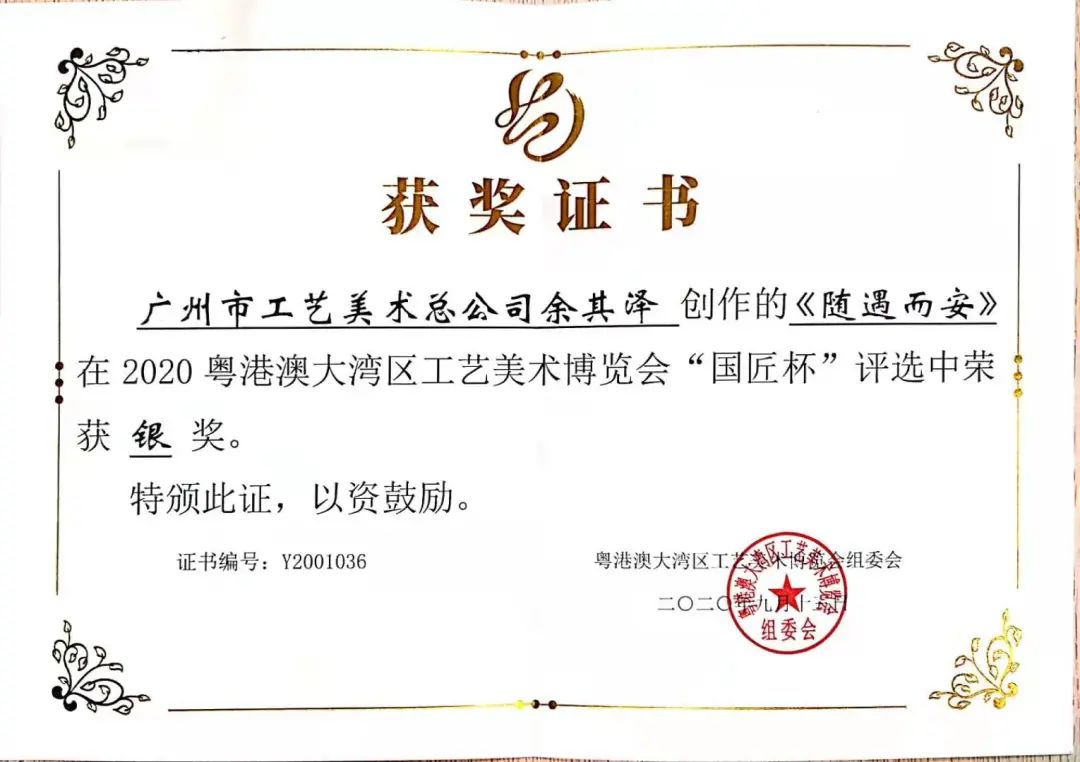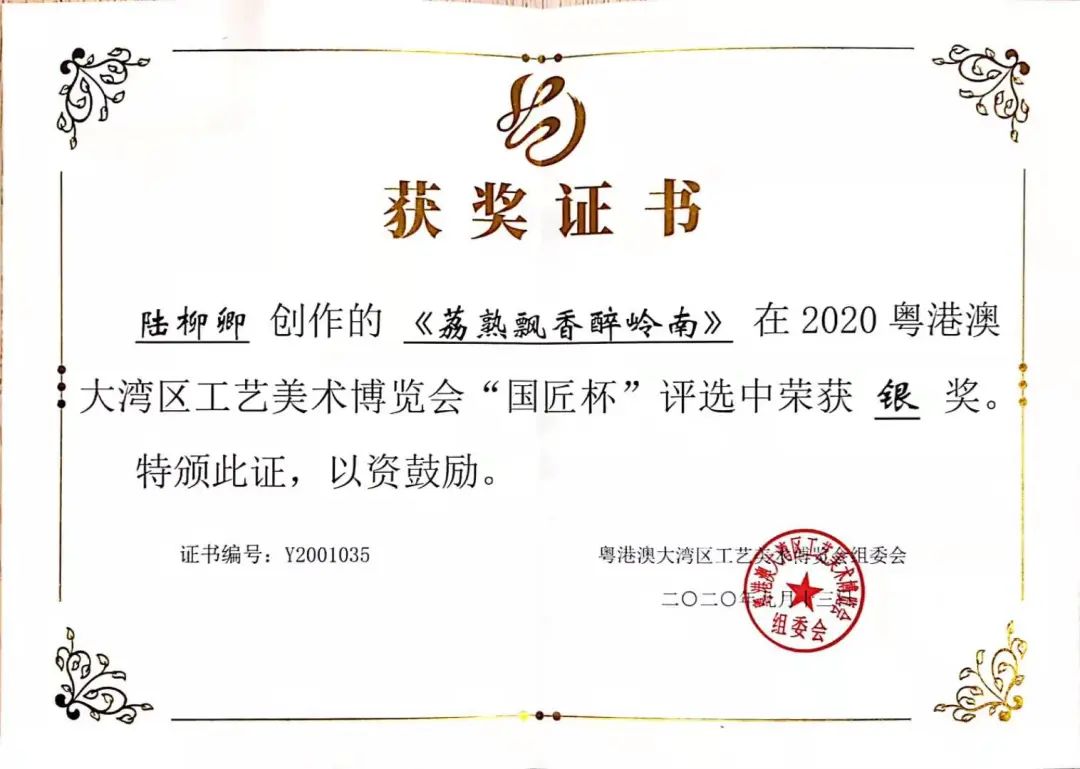 近日,2020粵港澳大灣區(qū)工藝美術展覽會“國匠杯”作品評選結果正式公布,廣州市工藝美術總公司余其澤《隨遇而安》玉雕作品、廣州市工藝美術研究所陸柳卿《荔熟飄香醉嶺南》廣繡作品獲銀獎;廣州市工藝美術研究所尹志強《荷塘清趣》玉雕作品獲銅獎。此次獲獎,是主辦方和參展觀眾對工美總公司、工美研究所在工藝美術領域的高度認可。 穗聯(lián)公司 陸嘉穎