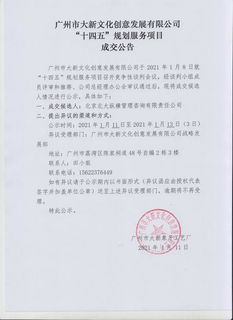 廣州市大新文化創(chuàng)意發(fā)展有限公司于2021年1月8日就“十四五”規(guī)劃服務項目召開競爭性談判會議,經(jīng)談判小組成員評審和推薦、公司總經(jīng)理辦公會審議通過后,現(xiàn)將成交候選人情況進行公示,具體如下: