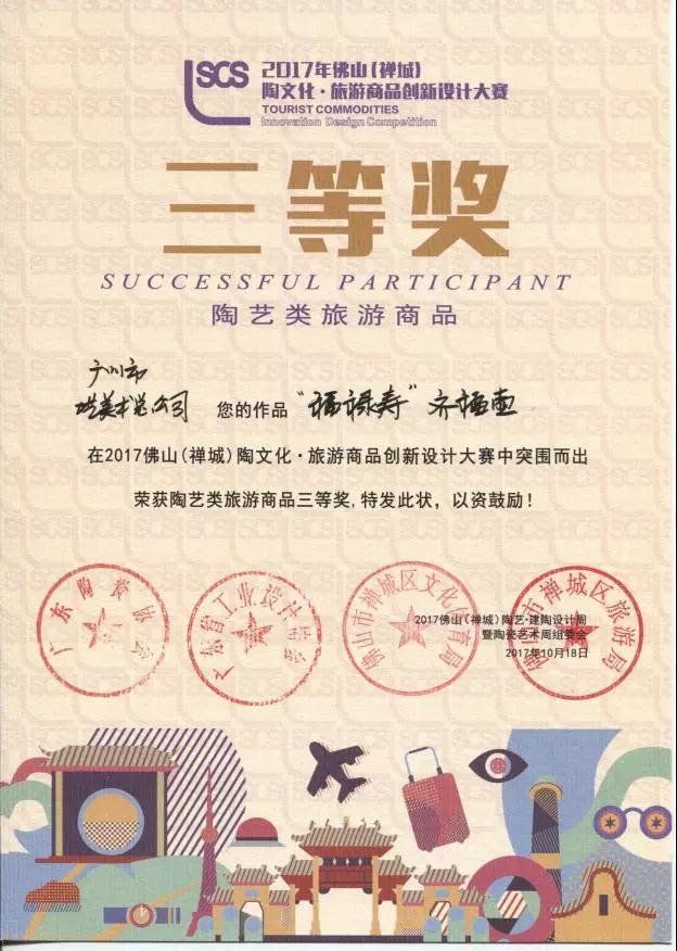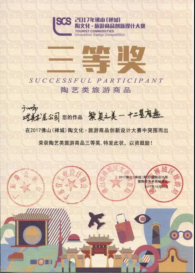 10月19日,第一福自主品牌的陶藝作品《福祿壽齊福壺》、《繁復(fù)之美-十二星座盤(pán)》榮獲由廣東省工業(yè)設(shè)計(jì)協(xié)會(huì)和廣東省陶瓷行業(yè)協(xié)會(huì)指導(dǎo)舉辦的 2017年佛山(禪城)陶文化·旅游商品創(chuàng)新設(shè)計(jì)大賽”三等獎(jiǎng)。