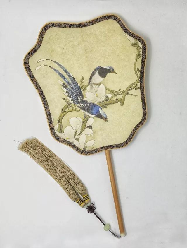 這把扇子根據(jù)廣東民間藝術(shù)博物館館藏文物《娟面八角形紈扇》仿制,扇子由中國(guó)制扇大師盛春監(jiān)制,扇框采用優(yōu)質(zhì)木料,做工精細(xì)。扇面利用細(xì)膩絹布印制了“滿大人”圖案和庭院人物,扇柄處增加鏤空設(shè)計(jì),細(xì)致立體。