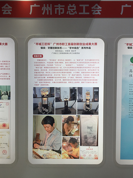 6月23日上午,“羊城工匠杯-廣州市職工首屆創(chuàng)新創(chuàng)業(yè)成果大賽"頒獎(jiǎng)儀式在廣州琶洲國(guó)際會(huì)展中心舉行。穗聯(lián)公司選送的牙雕創(chuàng)新技藝——“牙木結(jié)合”項(xiàng)目獲得銀獎(jiǎng)。廣州市總工會(huì)相關(guān)部門(mén)領(lǐng)導(dǎo)出席頒獎(jiǎng)儀式,并為獲獎(jiǎng)項(xiàng)目代表頒發(fā)牌匾和榮譽(yù)證書(shū)。
